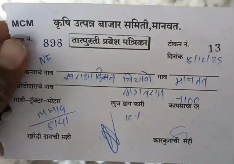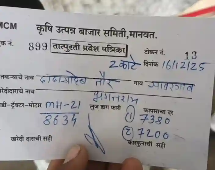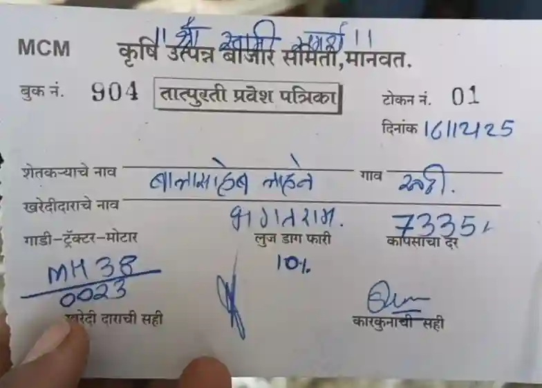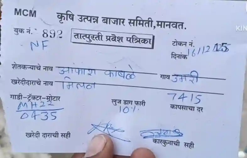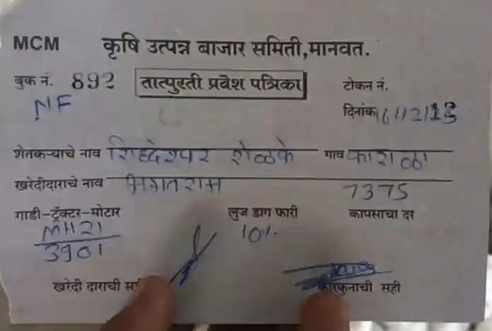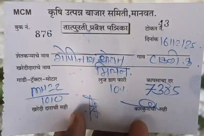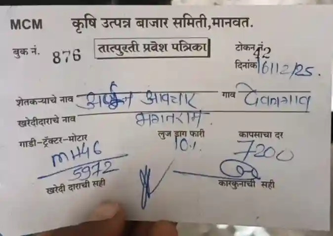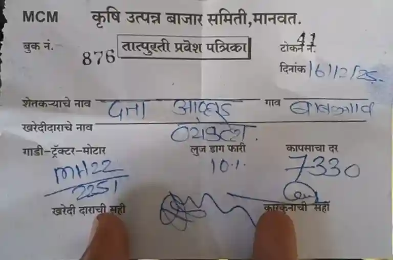 या दरांमुळे शेतकऱ्यांच्या चेहऱ्यावर आनंद पाहायला मिळाला आहे. मानवत बाजारपेठेतील आजच्या कापूस विक्रीच्या भावाच्या पावत्या खालीलप्रमाणे दिलेल्या आहेत.
